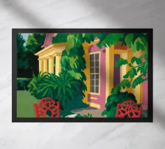 Un dipinto di un edificio modernista con un caratteristico tetto angolato, probabilmente in un luogo come Palm Springs, caratterizzato da linee pulite, palme e una fresca luce blu.