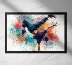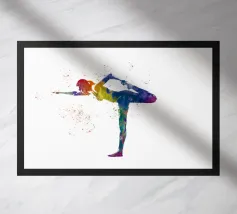 Questa colorata raffigurazione mostra una donna in una posa elegante durante un'esibizione di acrobazia aerea con sciarpe. La donna si aggrappa alle sciarpe dai colori vivaci con entrambe le braccia, mentre il suo corpo adotta una postura espressiva e dinamica. La sua posa trasmette leggerezza, forza e grazia allo stesso tempo. Le esplosioni di colore intorno alla figura rafforzano la sensazione di movimento e di espressione artistica. Lo sfondo è mantenuto in bianco puro, ponendo il soggetto in primo piano e concentrandosi interamente sull'acrobata.