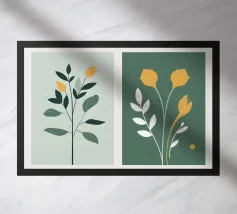 Un'affascinante griglia di quattro illustrazioni presenta un fiore, una felce, delle foglie e una farfalla, creando un bellissimo studio botanico in stile didattico.