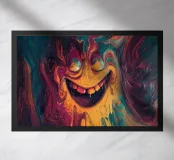 A visceral, high-energy abstract portrait formed from flowing pigment and thick, tactile texture. A distorted face emerges from molten colour, its exaggerated smile both playful and unsettling, as if caught mid-transformation. Sweeping currents of paint collide and drip, creating a sense of motion, heat, and emotional intensity that feels raw and immediate.