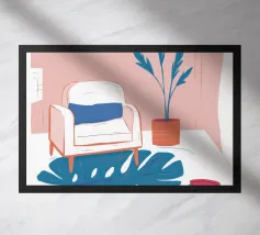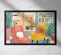 Una scena d'interni in cui una persona riposa su un'amaca all'interno di una stanza elegante con un'ampia finestra e numerose piante in vaso. L'opera d'arte cattura un momento di estremo relax e di tranquillità in interni.