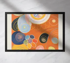 Questa vivace stampa d'arte presenta "The Ten Largest (No.4)" di Hilma af Klint, un'accattivante opera astratta del 1907. Su un caldo sfondo arancione, la composizione è piena di grandi forme organiche e geometriche sovrapposte in una tavolozza di rosa, gialli, blu e bianchi, che creano un senso di energia giocosa e di vita nascente. Intricati motivi floreali e linee vorticose aggiungono un'estetica dinamica e simbolica. Firmata "H. af Klint", quest'opera mostra la visione spirituale e astratta pionieristica di Klint, che esplora i temi della crescita e dello sviluppo. Questo poster digitale di alta qualità (7000x500