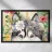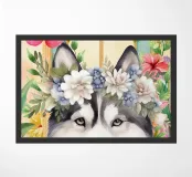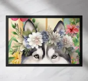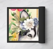 Un ritratto in stile acquerello raffigura un cane husky con una corona di fiori. Il cane ha una pelliccia bianca e nera e un'espressione dolce. La corona di fiori è composta da fiori bianchi e blu con foglie verdi. Lo sfondo è pieno di fiori colorati nelle tonalità del rosa, dell'arancione e del giallo, che creano un'atmosfera vibrante e allegra. Dietro il cane e i fiori è visibile la cornice di una finestra.