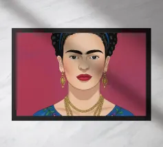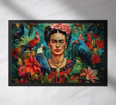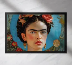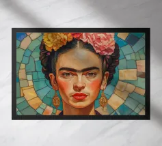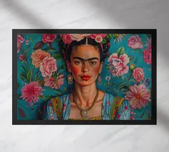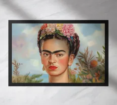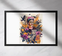 Questo vibrante ritratto di Frida Kahlo la ritrae in costume tradizionale messicano con una colorata corona di fiori che incarna il suo legame con il folklore e il simbolismo femminista.