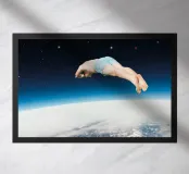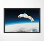 Un collage surreale che fonde il corpo umano con la vastità cosmica. Un tuffatore sospeso sopra la Terra trasforma il salto in una metafora di coraggio, libertà ed esplorazione dell'ignoto. Il contrasto tra la figura atletica e il cosmo infinito crea un'immagine suggestiva che unisce minimalismo e immaginazione onirica. Perfetto per chi apprezza l'arte moderna con un tocco surreale e cosmico.