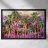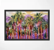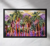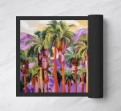 Un boschetto di palme è raffigurato in uno stile astratto e prismatico, con strisce verticali di colori vivaci e illuminati, viola, rosa e gialli, che creano una scena tropicale moderna ed energica.