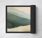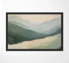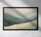 A minimalist oil painting with an impasto technique and bold brushstrokes, depicting green mountains against a pale yellow sky. A white river flows through the valley, with the neutral colour palette creating a calming effect. The distant hills are softly drawn and show a modern art style with abstract shapes and lines. The overall composition is harmonious and the soft lighting emphasises the scene.