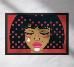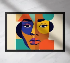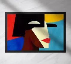 Il ritratto astratto di una donna nera ha un'espressione serena ed equilibrata, con le sue forme splendidamente integrate in uno sfondo di motivi e forme geometriche audaci e colorate.