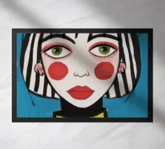 Un ritratto grafico di grande impatto di una donna con un'acconciatura nera e labbra rosse, con lo sguardo intenso rivolto all'osservatore, su uno sfondo colorato e astratto.