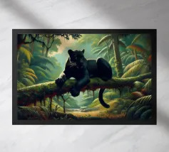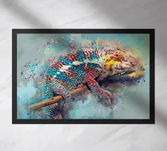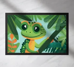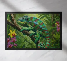 Questo camaleonte si è adattato magistralmente alla modalità relax. Con le zampe allentate sul bordo dell'amaca e uno sguardo di pura soddisfazione, è la prova vivente che a volte il pisolino è uno stile di vita. Questa stampa fa parte della serie "Jungle Hammock Tales" - relax estivo con una strizzatina d'occhio.