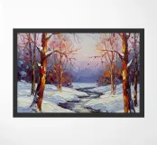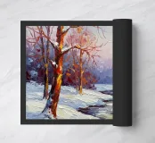 Questo affascinante dipinto a olio con la spatola cattura la tranquilla bellezza di un paesaggio invernale. I tratti spessi e strutturati danno vita alla scena, raffigurando un dolce ruscello che serpeggia in una foresta coperta di neve. La luce calda e dorata del sole al tramonto illumina gli alberi spogli, creando un contrasto sorprendente con i blu e i viola freddi della neve e del cielo. Questa opera d'arte originale è perfetta per aggiungere un tocco di pacifica serenità e di colore vibrante a qualsiasi spazio, da un accogliente salotto a una serena camera da letto. Si tratta di un'opera impressionistica e strutturata che invita a percepire l'aria frizzante e il cielo.