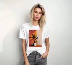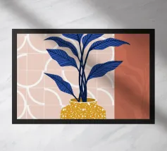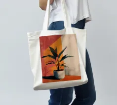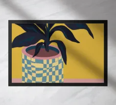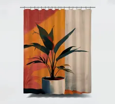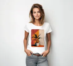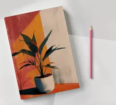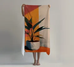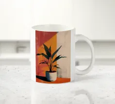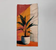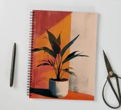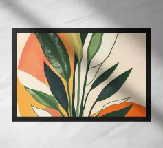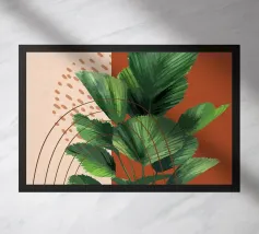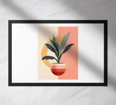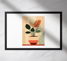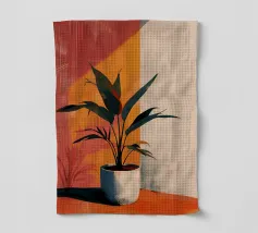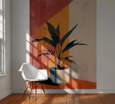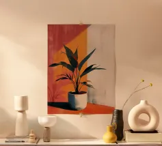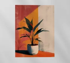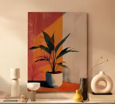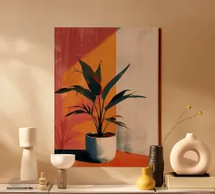 Un vibrante dipinto a olio raffigurante una pianta tropicale in vaso, ricco di toni caldi e contrasti decisi. I rossi profondi, gli arancioni e le tonalità dorate evocano calore e vitalità, mentre le pennellate strutturate aggiungono profondità e drammaticità a questa composizione lussureggiante in un interno vintage e all'avanguardia.