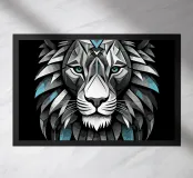 Questo disegno geometrico a testa di leone è realizzato nei toni del grigio, del bianco e del blu. I motivi intricati e le linee pulite offrono un'interpretazione sorprendente e moderna di questo maestoso animale.