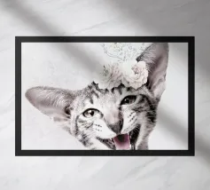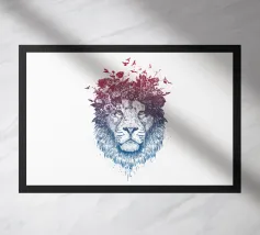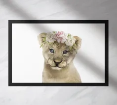 Il ritratto di un leone mostra grandi occhi espressivi e una corona floreale in bianco e nero. La morbida pelliccia è perfettamente enfatizzata in un'illustrazione fotografica minimalista e cattura lo straordinario fascino della natura. Ideale per gli amanti degli animali.