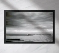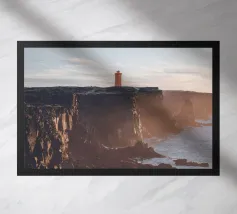 Fantastica fotografia in bianco e nero di onde alte, scogliere e un faro sulla frastagliata costa atlantica del Portogallo.