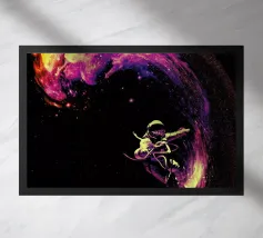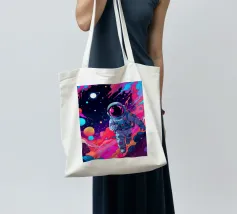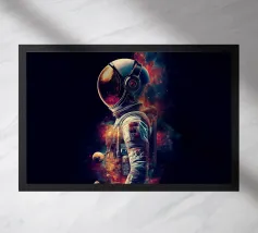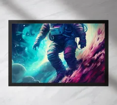 Una rappresentazione vibrante ed energica di un astronauta che sfreccia in un universo caleidoscopico. Nuvole nebulose nei toni del rosa, dell'arancio e del turchese avvolgono lo spazio, mentre pianeti colorati e stelle scintillanti riempiono lo sfondo scuro. La figura dell'astronauta, nella sua dettagliata tuta spaziale, trasmette un senso di movimento e avventura in mezzo alla vastità e alla bellezza del cosmo.