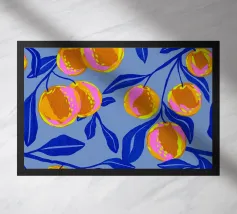 Aggiungete un'esplosione di fascino succoso e agrumato al vostro spazio con questa illustrazione audace e giocosa di vibranti mandarini. I frutti di colore arancione brillante, le foglie blu intenso e lo sfondo rosa tenue creano un contrasto moderno e accattivante che irradia calore ed energia. Questo motivo contemporaneo di frutta è perfetto per gli amanti dei disegni freschi e allegri e dell'estetica mediterranea.