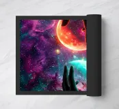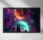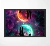 Questa ipnotica opera d'arte surreale raffigura due mani umane che si protendono attraverso una galassia vibrante, tenendo delicatamente due lune gemelle incandescenti sospese nello spazio cosmico. Ricca di colori nebulari, di profondità stellare e di luci drammatiche, la scena simboleggia l'equilibrio, la connessione e il controllo dell'universo. Il contrasto tra i toni caldi e freddi dei pianeti crea una potente armonia visiva, che fonde fantasia, spiritualità e fantascienza. Perfetto per gli amanti dell'arte cosmica, del simbolismo astratto e della decorazione murale moderna, questo disegno aggiunge energia, immaginazione e un'audace dichiarazione celeste a qualsiasi ambiente.
