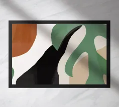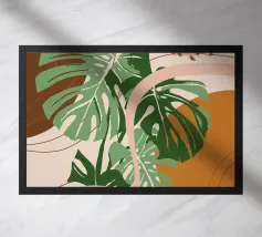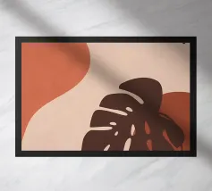 L'immagine presenta un'illustrazione astratta con una grande foglia di monstera nera e il contorno di una mano. Lo sfondo è costituito da forme morbide e fluide nei toni del beige e del marrone, che creano un'atmosfera armoniosa e organica.