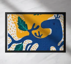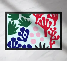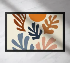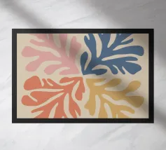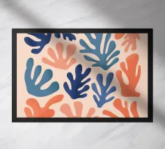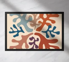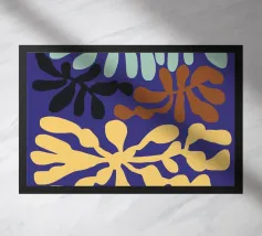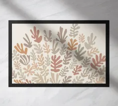 Un motivo di foglie stilizzate nei toni del verde, del rosa e della terracotta, ispirato ai ritagli di Henri Maraoui. La disposizione suggerisce una danza aggraziata di forme botaniche.