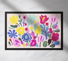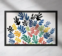 Una vibrante e gioiosa composizione astratta di foglie colorate e forme organiche nello stile dei ritagli di Henri Maraoui. La composizione è dinamica e piena di vita.
