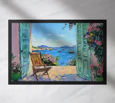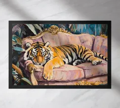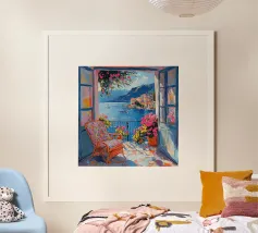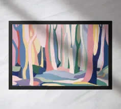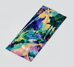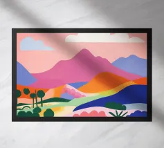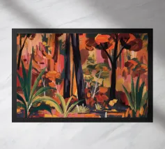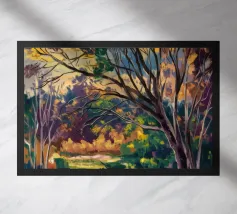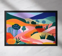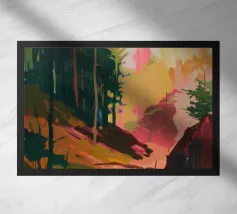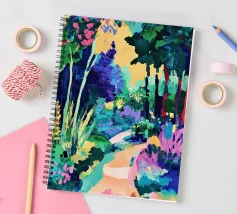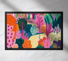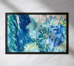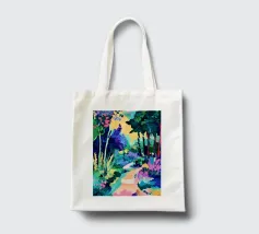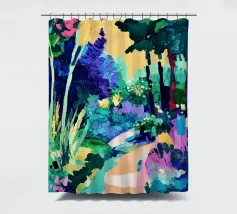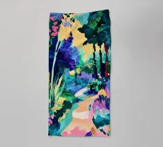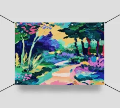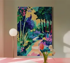 Un sentiero che attraversa un giardino all'inglese, circondato da una vegetazione vivace e da fiori sbocciati nei toni del rosa, del viola, del blu, del giallo e del verde acqua, dipinti con audaci pennellate di pittura acrilica, creando una scena vibrante e colorata che ricorda lo stile di Matisse. I colori sono brillanti e saturi e aggiungono profondità alla composizione, mentre le ombre morbide aggiungono dimensione a elementi come alberi, fogliame, cespugli e rocce. Questo dipinto evoca gioia e giocosità, creando un effetto allegro.