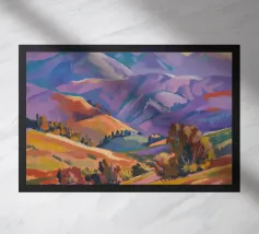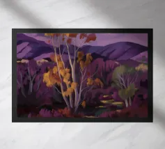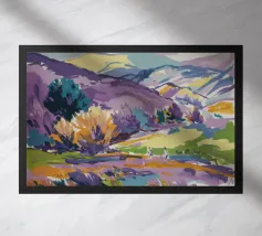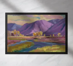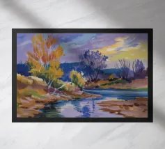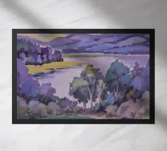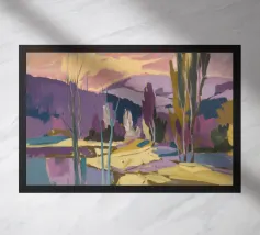 Un dipinto paesaggistico espressivo raffigura un fiume che serpeggia in una valle con alberi dalle tonalità autunnali o crepuscolari di rosa, arancione e viola, sotto un cielo drammatico e colorato, che evoca una scena lunatica e vibrante.