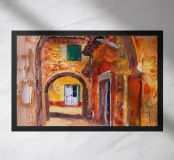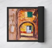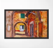 Una vista attraverso un arco in pietra rustica e rovinata dalle intemperie rivela una vivace scena di mercato, con i toni caldi e terrosi dell'architettura che creano una cornice senza tempo per un momento di vita quotidiana.