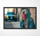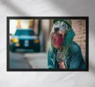 Mick, San Francisco's punk dog, was roaming the streets of the Tenderloin in search of his next adventure. His flashy tattoos and extravagant appearance attracted curious looks. Mick lived life to the full, enjoying every moment, whether it was partying with his human friends or dancing in underground clubs.
