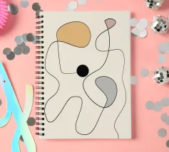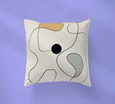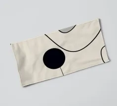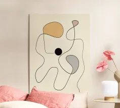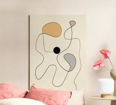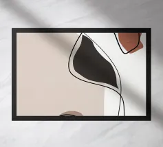 Forme e linee astratte si intrecciano in un design minimalista, caratterizzato da colori tenui come ocra, nero e grigio. Linee curve e fluide creano un senso di movimento, collegando varie forme geometriche.