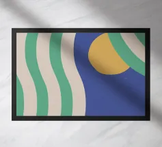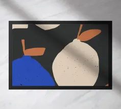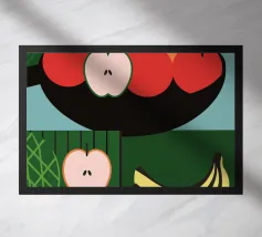 Una composizione minimalista presenta una ciotola con due frutti rossi su uno sfondo a motivi geometrici. I colori vivaci e le forme astratte creano un'immagine moderna e di grande impatto.