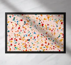 Quest'opera d'arte è un vivace motivo ispirato al terrazzo, caratterizzato da una serie di frammenti di forma irregolare nei toni del verde acqua, del bianco e del grigio, accentuati da punte di arancione e giallo caldo. I pezzi sparsi sono collocati su uno sfondo verde menta, creando una composizione armoniosa e dinamica. Il design evoca un senso di modernità e giocosità, fondendo forme organiche con un'estetica pulita e contemporanea. Perfetto per l'interior design, i tessuti e le applicazioni digitali, questo pezzo cattura il fascino senza tempo del terrazzo con un tocco artistico e fresco.