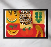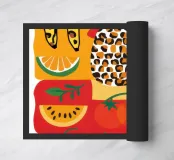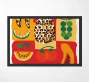 Una composizione vivace e generosa di vari frutti tropicali stilizzati come ananas, papaya e anguria. L'opera d'arte è una celebrazione colorata e gioiosa delle dolci offerte esotiche della natura.
