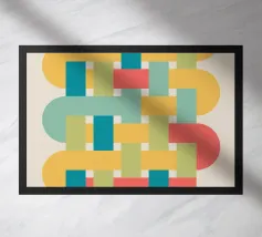 Le forme geometriche si intersecano e si sovrappongono in una complessa rete di linee e colori, creando un'estetica astratta e moderna. Diverse tonalità, tra cui giallo, verde, viola e blu, si stagliano su uno sfondo neutro, aggiungendo vivacità alla composizione angolare.