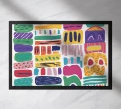 Un complesso e vivace motivo astratto di strisce verticali, simili a totem, riempite con varie forme geometriche, linee e motivi, che creano una composizione visivamente stimolante.