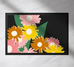 Un motivo semplice e allegro di margherite stilizzate in vari colori su uno sfondo scuro crea un disegno floreale classico, bello e senza tempo.