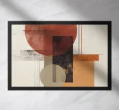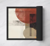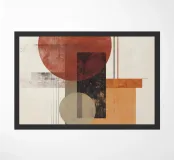 Un'audace opera d'arte astratta con cerchi, rettangoli e linee sottili in rosso ruggine, nero, beige e arancione. La finitura strutturata conferisce un tocco vintage, rendendola ideale per interni moderni, boho o di metà secolo.