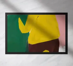 Una moderna natura morta astratta con una pianta stilizzata in un vaso blu, un croissant e forme organiche sotto un sole giallo, il tutto in una composizione equilibrata e calda.