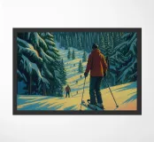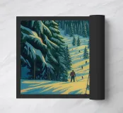 Uno sciatore si ferma al limite degli alberi, guardando il Monte Bachelor immerso nella luce dorata del tramonto. Sempreverdi innevati incorniciano la maestosa vetta, mentre ombre morbide si allungano sulle piste piene di polvere. Quest'opera d'arte cattura la tranquilla audacia del terreno alpino, un momento di silenzioso stupore nella luce alpina della natura.