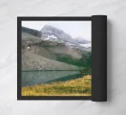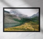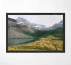 This captivating photograph offers a serene view of a mountain lake, perfectly reflecting the surrounding rugged peaks and patches of snow. Partially covered with green vegetation, the majestic mountains reach up towards a partly cloudy sky, adding a touch of mystique to the landscape. Ideal for nature enthusiasts and those who appreciate the calm beauty of the outdoors, this image brings a sense of peace and natural splendor to any space.