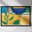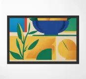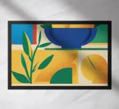 Una moderna natura morta geometrica con una ciotola di agrumi e un pezzo di formaggio, disposti in un'audace composizione a blocchi di colore. Le linee pulite e i colori vivaci danno un tocco contemporaneo a un soggetto classico.