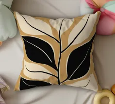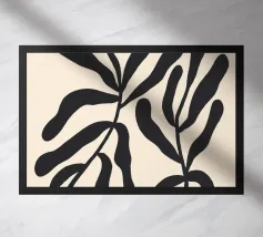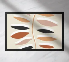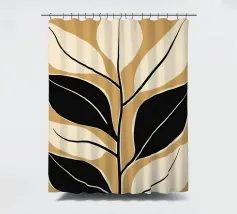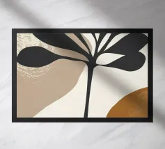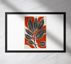 Un disegno botanico stilizzato presenta foglie nere e crema su uno sfondo caldo e abbronzato. Il contrasto tra gli elementi scuri e quelli chiari mette in risalto le forme semplici e suggestive delle foglie.