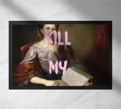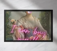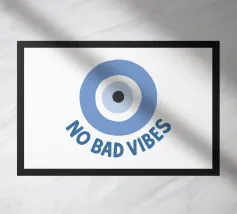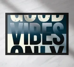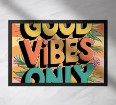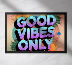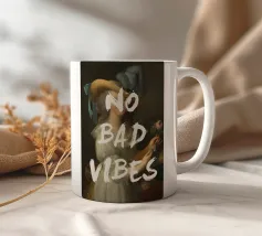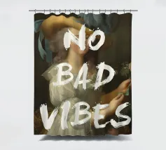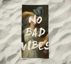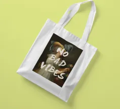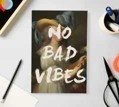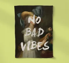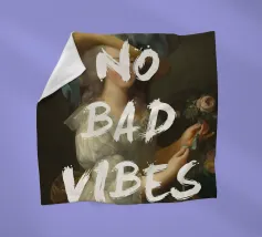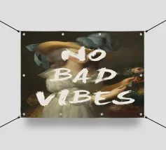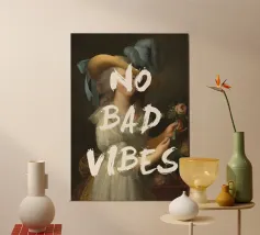La frase "No Bad Vibes" è sovrapposta in modo giocoso all'immagine, creando un messaggio spensierato ed edificante che trascende il tempo e gli stili artistici",