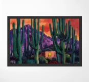 Alti cactus si ergono come sculture contro un cielo drammatico, rosso fuoco e viola intenso, creando una scena del deserto potente e lunatica che sembra allo stesso tempo surreale e intensamente bella.