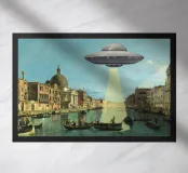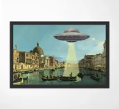 Alieni nelle loro astronavi UFO che vengono a rapire alcune gondole nei canali di un dipinto vintage di Venezia, Italia. Surreale, divertente, fantascientifico, retrofuturo, collage digitale di MsGonzalez
