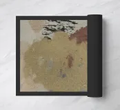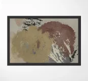 Moderna opera d'arte astratta con forme organiche e morbide, pennellate, linee e texture nelle calde tonalità della terra di marrone, ruggine, grigio e beige.
