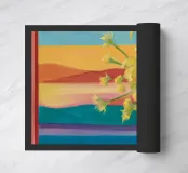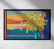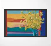 Un vaso blu di fiori gialli risplende davanti al dipinto di un tramonto dorato, fondendo natura e arte in toni radiosi.