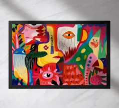 Un paesaggio surreale pieno di figure astratte, animali e forme geometriche. L'uso dinamico di colori vivaci e disegni intricati evoca immaginazione e curiosità.