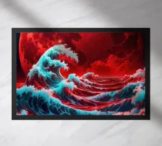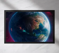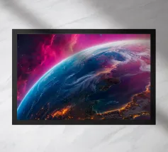 L'immagine ritrae una vista ravvicinata di Marte, che mostra la sua caratteristica superficie rosso-arancio. Un'importante fessura attraversa il pianeta, emettendo un bagliore ardente che suggerisce un'attività vulcanica. Il pianeta è immerso in un cielo scuro e stellato, con una debole nebulosa blu e rossa visibile sullo sfondo.