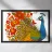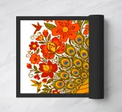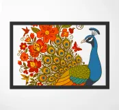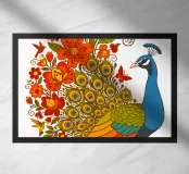 Una lussureggiante illustrazione di un pavone e di un bouquet di fiori rosso-arancio. Una tavolozza calda ed estiva, ideale per creare un'atmosfera botanica e di tendenza nella vostra casa.